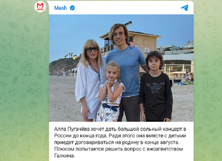 Певица Алла Пугачёва может вернуться с концертом в Россию. Такая информация появилась на днях в российских изданиях. Сообщалось, что параллельно "примадонна" из особняка в Израиле и виллы на Кипре приехала договариваться за мужа-иноагента Максима Галкина*, чтобы с него сняли этот статус. Точнее за то, чтобы он таковым быть перестал.