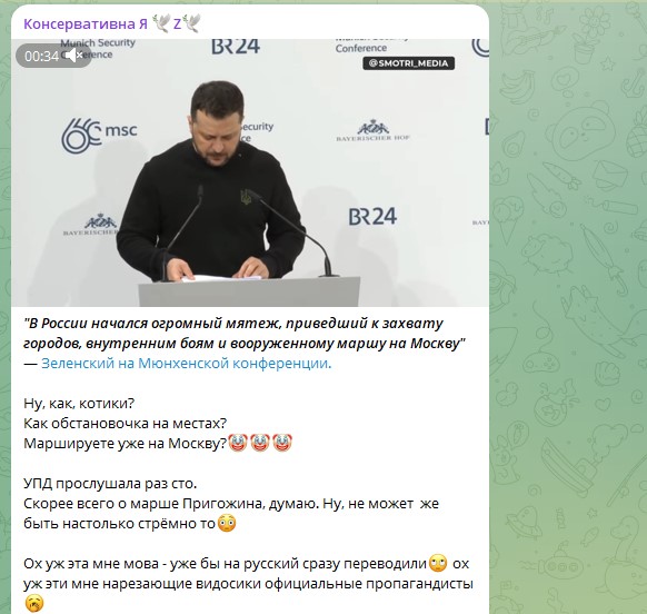 Выступая на Мюнхенской конференции, украинский лидер заявил, что Украина "разрушила мифы России" и довела её до колоссального мятежа и едва ли не до внутренней войны.