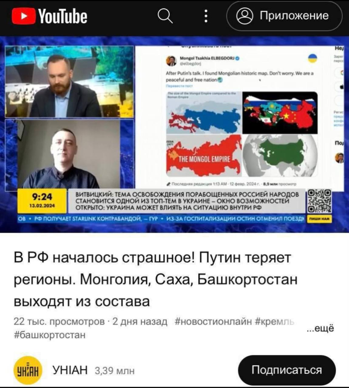Не отстают и украинские СМИ. Так издание УНИАН, чтобы отвлечь украинцев от разгрома ВСУ в Авдеевке разразилось сенсацией. Оказывается, для России всё кончено, из её состава выходит… Монголия. Комментировать такое - только портить.