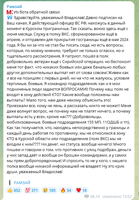 Это обращение в своём телеграм-канале "Рамзай" обнародовал военный эксперт Владислав Шурыгин. Ему в "предложку" написал действующий офицер русской армии. Боец уточнил, что с мая этого года служит в приграничье, в Курской области. С июня задействован в боестолкновениях.
