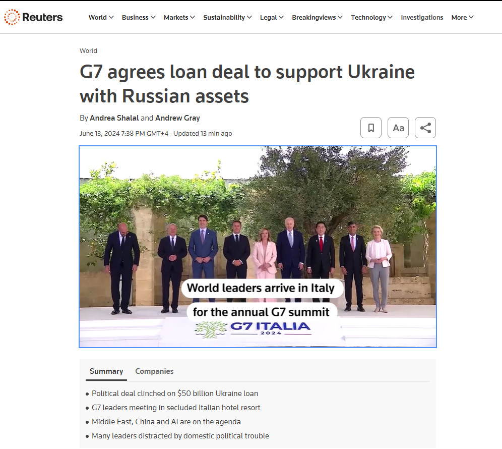 Ранее страны "Большой семёрки" договорились предоставить Киеву кредит на $50 млрд, который будет погашаться за счёт прибыли от замороженных русских активов. СКРИНШОТ СТРАНИЦЫ САЙТА REUTERS.COM
