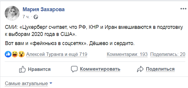 СМИ: "Цукерберг считает, что РФ, КНР и Иран вмешиваются в подготовку к выборам 2020 года в США". Вот вам и "фейкньюз в соцсетях". Дёшево и сердито.