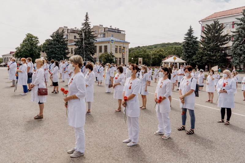 В городе Железноводске Ставропольского края прошёл первый в истории марш врачей. Медики и сотрудники санаторно-курортных учреждений торжественно прошли по центральной улице и возложили цветы к мемориалу "Вечный огонь".