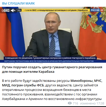 Возвращение к миру началось. Путин создаст гуманитарный центр для помощи Карабаху