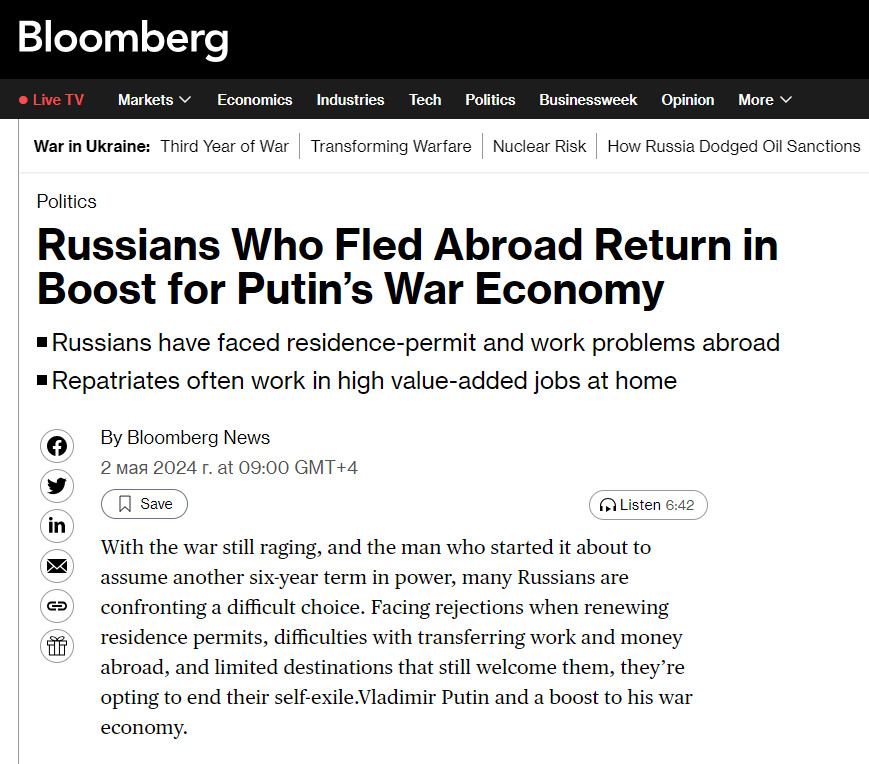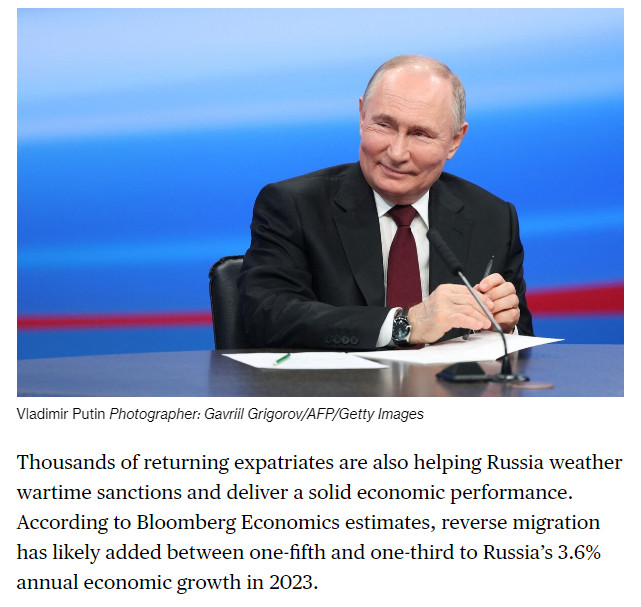 ТЫСЯЧИ ВОЗВРАЩАЮЩИХСЯ ЭКСПАТРИАНТОВ ТАКЖЕ ПОМОГАЮТ РОССИИ ПЕРЕЖИТЬ САНКЦИИ ВОЕННОГО ВРЕМЕНИ И ДОБИТЬСЯ ВЫСОКИХ ЭКОНОМИЧЕСКИХ ПОКАЗАТЕЛЕЙ. ФОТО: СКРИНШОТ СТРАНИЦЫ САЙТА BLOOMBERG.COM