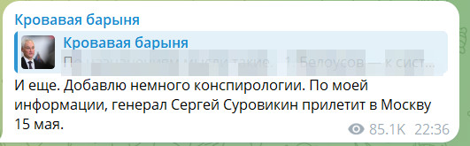 Добавлю немного конспирологии. По моей информации, генерал Сергей Суровикин прилетит в Москву 15 мая,