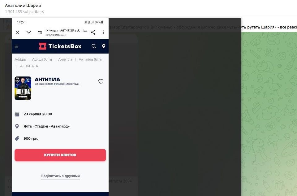 В апреле текущего года объявились и другие "пророки", обещавшие прибыть в Крым, - украинская музыкальная группа "Антитела". Участники коллектива не только анонсировали 23 августа 2024 года концерт на стадионе "Авангард" в Ялте (дата выбрана не случайно: 24 августа - День независимости Украины), но и абсолютно серьёзно начали продавать билеты на это выступление.