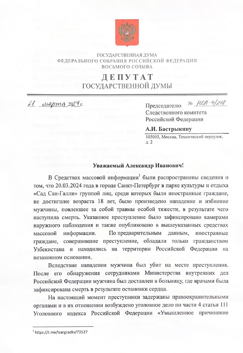 В очередной раз мы видим, как совершенно конкретные должностные лица (а у всех в таких делах есть конкретные имена и фамилии) пытаются, цинично манипулируя фактами, смягчить квалификацию преступления, совершенного "школьниками из Узбекистана", представителями неОПГ-диаспор,