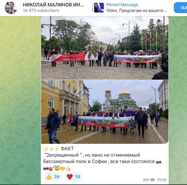 Он также приложил к посту фото с шествия. Малинов уточнил в разговоре с Царьградом, что накануне праздника муниципалитет столицы Болгарии запретил проводить "Бессмертный полк". Притом решение касалось только Софии, власти остальных болгарских городов не выступали против акции.