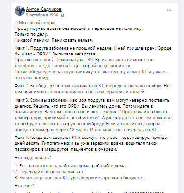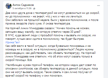 Несколькими подобными вопиющими историями поделился у себя в Facebook главный редактор Царьград Урал Антон Садчиков. Несколько его друзей тяжело заболели, лежат дома с высокой температурой. Но дозвониться до медиков не могут.