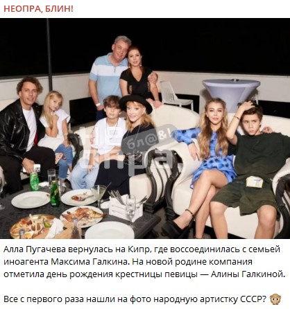 Telegram-канал "НЕОПРА, БЛИН!" обнародовал фотографию Пугачёвой с Кипра. Отмечается, что там экс-примадонна воссоединилась с семьёй иноагента Максима Галкина*. На новой родине компания отметила день рождения крестницы певицы - Алины Галкиной.