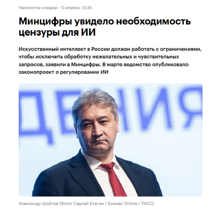 В России предложили ввести цензуру для искусственного интеллекта (ИИ). Как заявил замглавы Минцифры Александр Шойтов, искусственный интеллект нужно ограничить "на входе и на выходе" в том, что касается нежелательных и чувствительных запросов от пользователей.