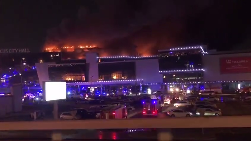 "Крокус Сити Холл" в огне. Фото: скриншот видео очевидца