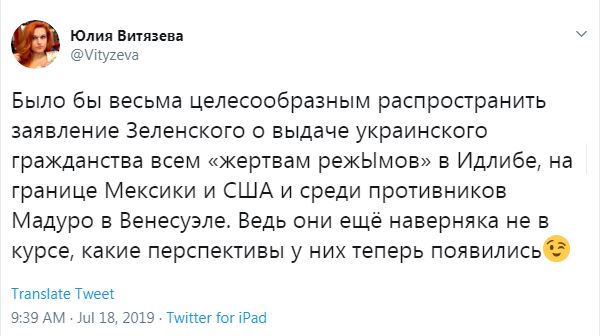 В Сети комментируют решение президента Украины Владимира Зеленского разработать механизм упрощенного получения украинского гражданства. По мнению микроблогера Юлии Витязевой, было бы целесообразно распространить эту инициативу для всех "жертв режымов" в Идлибе, на границе Мексики и США и среди противников Мадуро в Венесуэле.