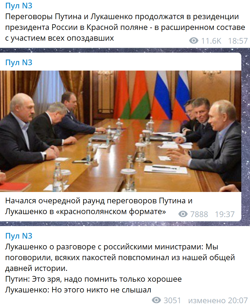 Журналист кремлёвского пула Дмитрий Смирнов пересказал диалог, состоявшийся между российским и белорусским президентами во время одного из раундов переговоров. В ходе диалога Лукашенко "повинился" перед Путиным, рассказав, как пообщался с членами нового состава кабмина: "Всяких пакостей повспоминал из нашей общей давней истории". На это Президент РФ его мягко пожурил: "Это зря…"