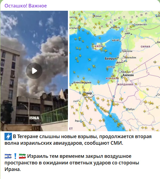 Новая серия взрывов в Тегеране. Сейчас Израиль показывает, как примерно начиналась бы война против России, если бы не 22.02.2022. С масштабной провокации, "превентивного отведения угроз". <…> Будет очень правильно, если Иран и Израиль разберутся как-то между собой. Без посторонней помощи. Но Трамп обязан Израилю и давление на него будет огромное. Также важно, что сейчас в США ночь, и давлению будет подвергаться центральное командование США, у которого могут найтись основания вмешаться. Также интересный вопрос: а зачем Израилю третья мировая война?,