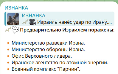 Произошло то, чего все ожидали из-за очевидной неизбежности , и чего все опасались – началась атака на Иран. В 09:30 - молниеносный ракетный удар по Тегерану. Предварительно, целью может быть военный штаб КСИР или ядерный объект. Израильские СМИ заявляют об атаке по президентскому дворцу. Израиль дал понять, что устал ждать отмашки США и решил действовать первым. Более 500 истребителей в ближайшие часы могут начать бомбардировку военной и энергетической инфраструктуры персов.