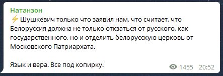 Журналист Станислав Натанзон сообщил о заявлении Шушевича. Политик, ратующий за отказ от русского языка как от государственного, считает, что необходимо и Белорусскую Церковь отделить от Московского Патриархата.