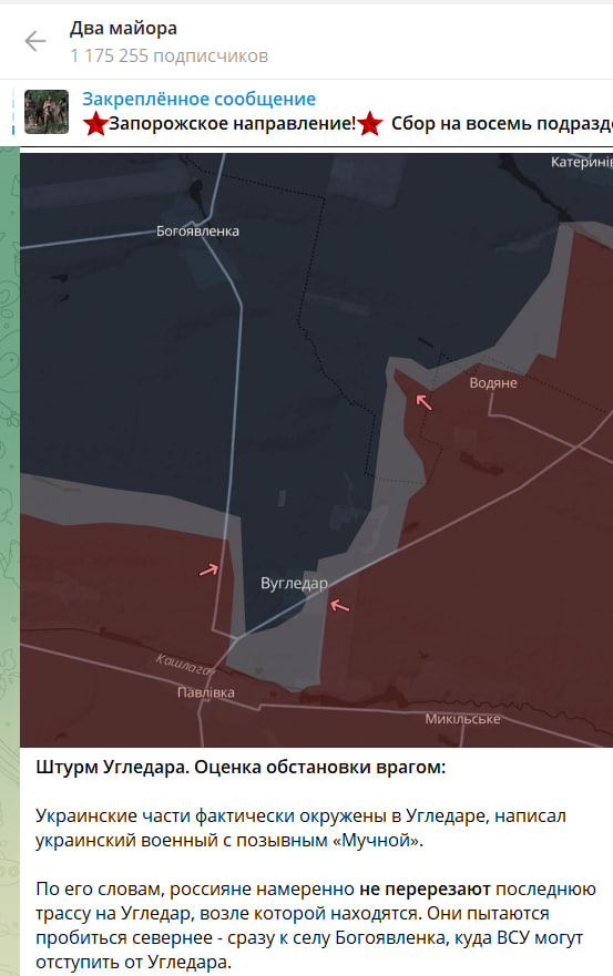 Все пути снабжения противника находятся под нашем огневым контролем, пишет политик Олег Царёв. От шахты "Южнодонбасская-3" наши войска атакуют сразу в трёх направлениях: на юг, запад и север. Сообщается, что единственный путь обхода для ВСУ из угледарского котла намеренно не закрывается - наши войска по флангам наступают к селу Богоявленка, куда бегут части противника. Таким образом, наши войска бьют в тыл солдатам ВСУ в городе и на его окраинах по направлению к Богоявленке. Военкоры "Два Майора" приводят слова солдата ВСУ с позывным "Мучной":