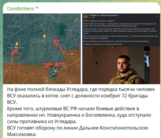 Также поступает информация, что командир 72-й бригады ВСУ, застрявшей в угледарском котле, снят с должности. Более того, он, по сути, предал своих подчинённых, попрощавшись с ними из Киева.
