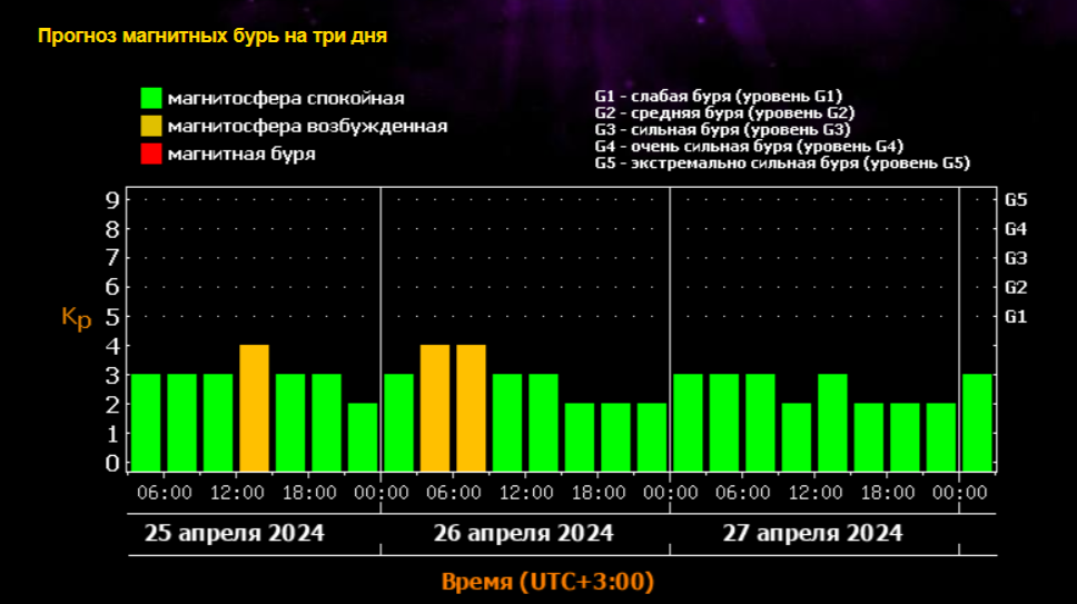 В прогнозе уточняется, что сила геомагнитных ударов 25 и 26 апреля составит 4 балла, а вероятность слабых геомагнитных возмущений для обоих дней составляет около 40 %.