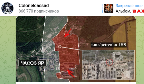 Военный блогер Михаил Звинчук в своём телеграм-канале "Рыбарь" уточнил, что на Бахмутском направлении в пригороде Часова Яра штурмовые подразделения Вооружённых сил России продвинулись в центральной части микрорайона "Канал", заняв опорный пункт противника.