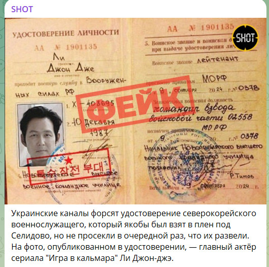 Украинские каналы сейчас распространяют удостоверение северокорейского военнослужащего, который якобы был взят в плен под Селидово, но не поняли в очередной раз, что их развели. На фото, опубликованном в удостоверении, - главный актёр сериала "Игра в кальмара" Ли Джон-Джэ.
