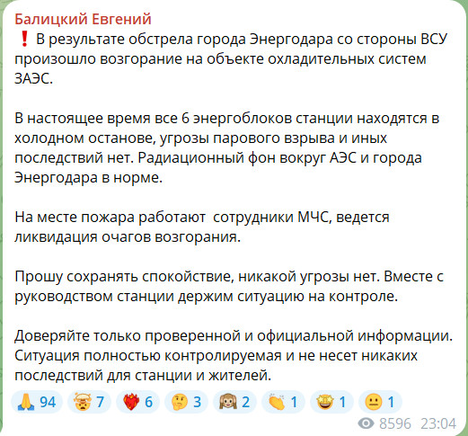 Балицкий пояснил, что в настоящее время все шесть энергоблоков станции находятся в холодном останове, угрозы парового взрыва и иных последствий нет.