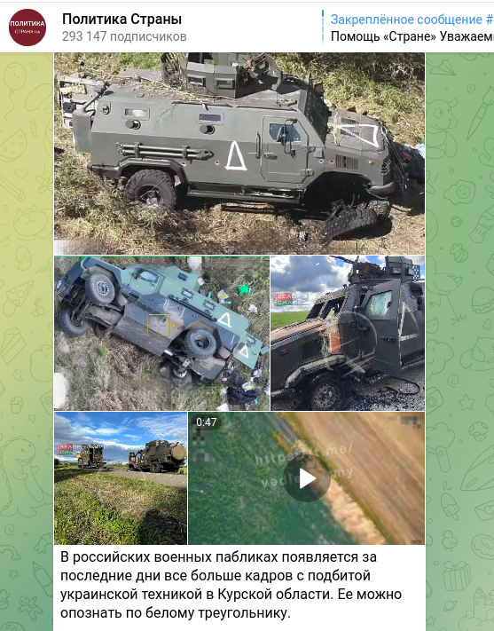 В военных пабликах публиковалось много фотографий подбитой и уничтоженной техники ВСУ, принимавшей участие в оккупации Курщины, на боку которой красовался белый треугольник.