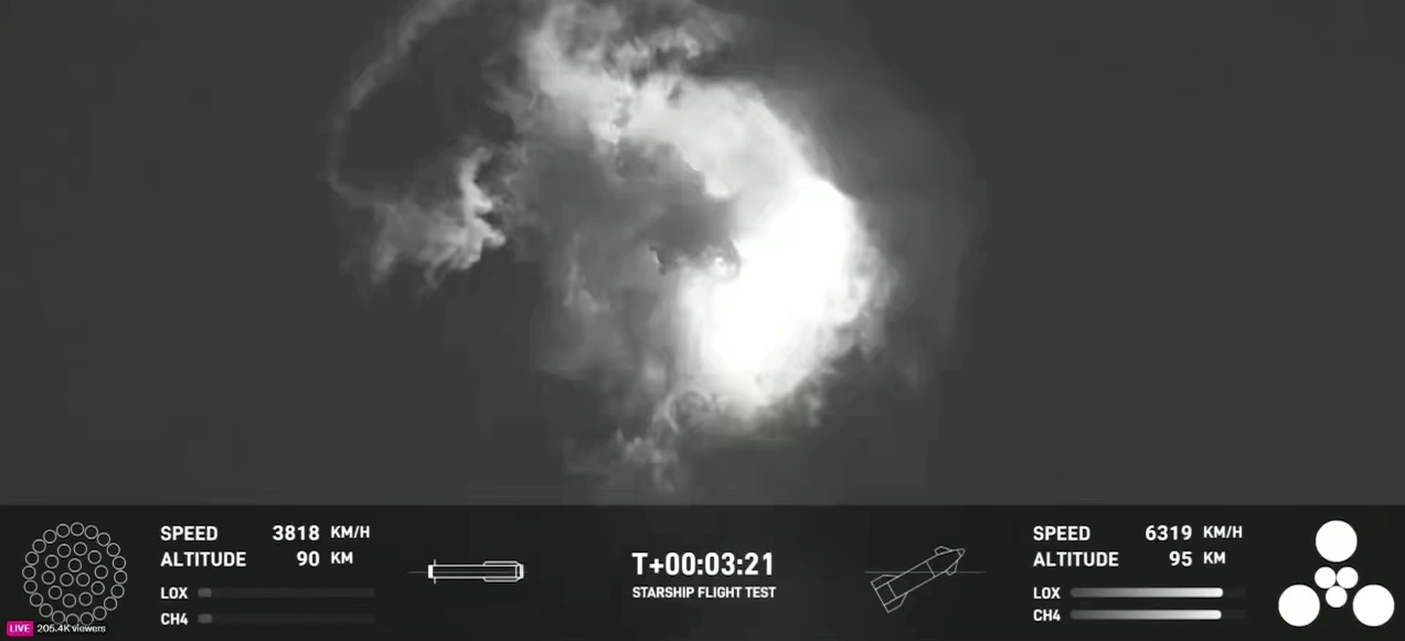 Взрыв первой ступени. Фото: скриншот трансляции запуска Starship