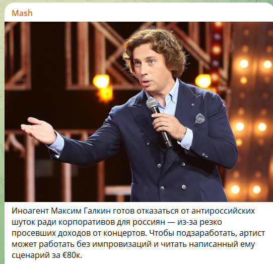 Но вот, проходит немного времени, и сразу несколько независимых источников, в том числе из окружения Пугачёвой, заявили, что Пугачёва планирует вернуться в Россию с большим прощальным концертным туром. Гонорары певицы и её мужа-иноагента Галкина*, получивших гражданство Израиля, заметно просели в последнее время, юморист соглашается на любые халтурки - готов даже на корпоративы для русских бизнесменов, готов даже отказаться от русофобских шуток и вообще читать написанный ему сценарий, даже славить Россию всего за 8 млн рублей. Ранее за ведение украинских свадеб на мове он запрашивал 10 млн. Видно, не пользуется популярностью.
