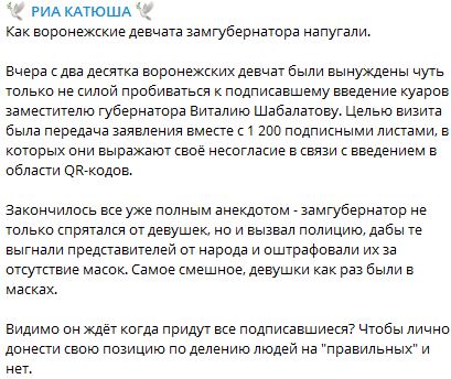 Около 20 жительниц Воронежа накануне пришли к административному зданию, где работает заместитель губернатора Виталий Шабалатов, и передали ему свой протест против введения системы QR-кодов. Под требованием не вводить коды подписалось свыше тысячи воронежцев.