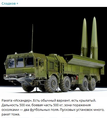 На использование "Искандеров", к слову, намекает и военный корреспондент Александр Сладков. После сегодняшней террористической атаки он выложил ёмкий пост с намёком.