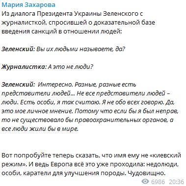 Официальный представитель МИД России Мария Захарова обратила внимание на эти слова. Она заметила, что в Европе, которая сегодня дружит с Украиной, тоже когда-то рассуждали про "недолюдей", но сегодня европейцам стыдно об этом вспоминать.