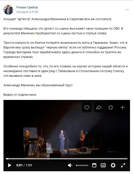 Депутат Саратовской областной думы Роман Грибов рассказал у себя в соцсетях, что Александр Малинин обещал со сцены поддержать проведение специальной военной операции, но обещание не выполнил.