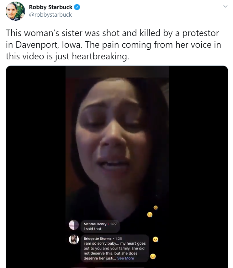 22-летняя американка Италия Мари Келли погибла во время стрельбы в городе Давенпорте (штат Айова). Её сестра записала пронзительное видео, в котором обвинила в гибели сестры протестующих.