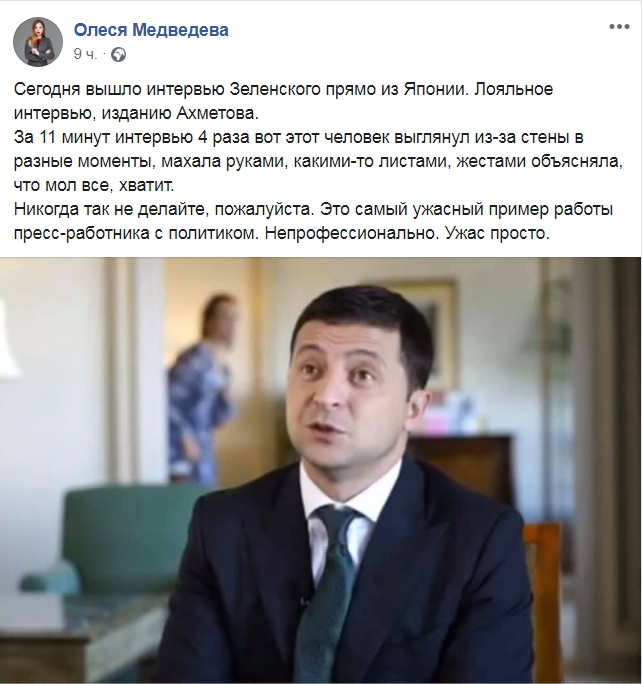 В Токио у Владимира Зеленского взяло интервью украинское издание "Сегодня". Можно предположить, что бурной жестикуляцией Юлия Мендель хотела дать понять журналистам, что интервью пора заканчивать. Правда, способ она выбрала не самый лучший.