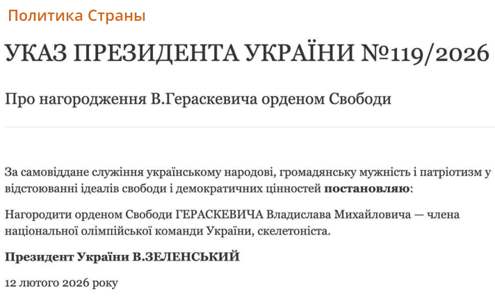 Экс-президент Украины Владимир Зеленский распорядился наградить скелетониста Владислава Гераскевича орденом Свободы за то, что тот не стал отказываться от шлема с фотографиями погибших украинских спортсменов на Олимпиаде в Италии.