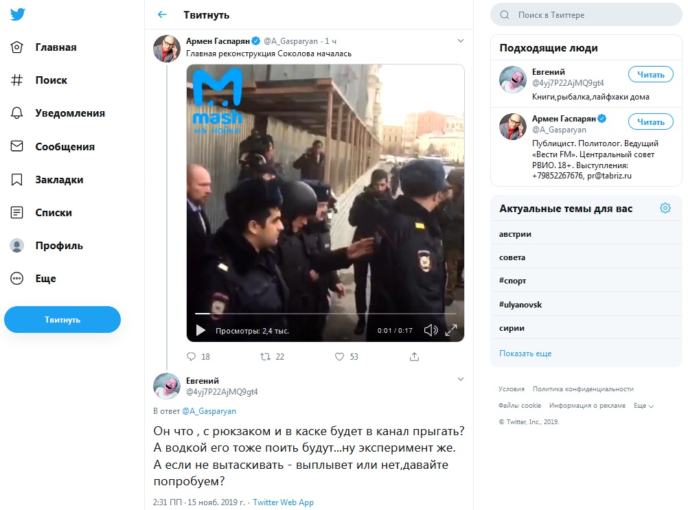 "Он что, с рюкзаком и в каске будет в канал прыгать? А водкой его тоже поить будут... ну эксперимент же. А если не вытаскивать - выплывет или нет, давайте попробуем?" - добавляет Евгений @4yj7P22AjMQ9gt4.