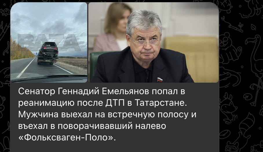 По информации телеграм-канала БАЗА, бывший мэр Елабуги и член комитета Совета Федерации по аграрно-продовольственной политике Геннадий Емельянов попал в жуткое ДТП в Татарстане.