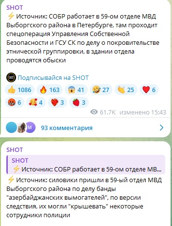 И вот в деле появился новый поворот. Как сообщает телеграм-канал SHOT, в 59-й отдел МВД по Выборгскому району Петербурга нагрянул СОБР. Всё в рамках спецоперации УСБ и ГСУ Следственного комитета России по делу о покровительстве этнической группировки. Идут обыски.