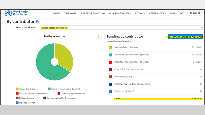 ДАННЫЕ О ПОЖЕРТВОВАНИЯХ США В ВОЗ НА ДЕКАБРЬ 2023 ГОДА. ФОТО: СКРИНШОТ OPEN.WHO.INT