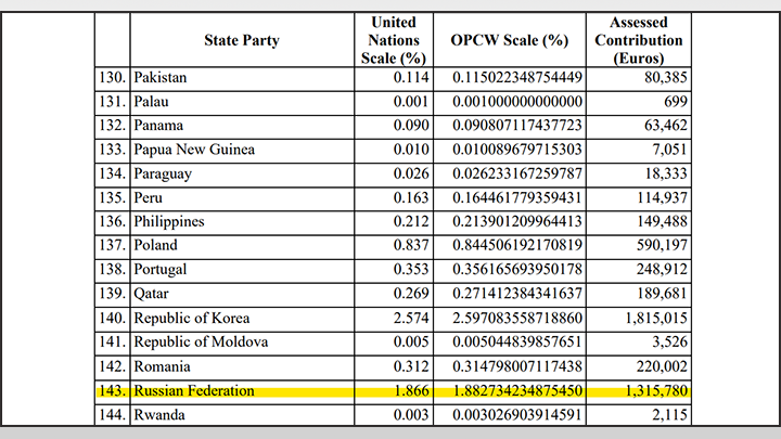 УРОВЕНЬ ЕЖЕГОДНЫХ ВЗНОСОВ РОССИИ В ОЗХО В 2023–2024 ГОДАХ. ФОТО: СКРИНШОТ OPCW.ORG