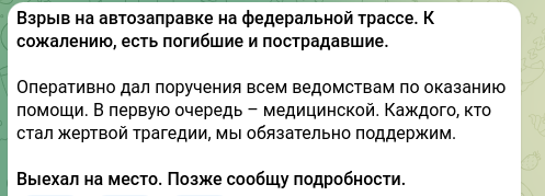 К сожалению, есть погибшие и пострадавшие, - написал он. - Оперативно дал поручения всем ведомствам по оказанию помощи. В первую очередь - медицинской. Каждого, кто стал жертвой трагедии, мы обязательно поддержим.