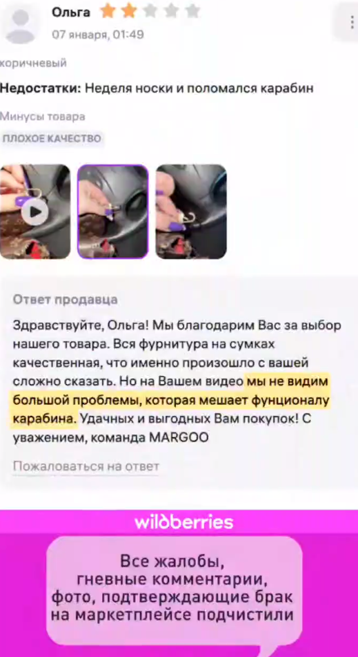 Но это далеко не всё. Есть контрафакт с некачественной фурнитурой. Есть сумки, разваливающиеся через пару дней использования. Всей этой продукции самое место если н на свалке, то как минимум на складах продавца. И каждый покупатель контрафакта пытается отправить товар по адресу назначения. Но вернуть покупку обратно не получится. Тут включается особый механизм работы Wildberries.
