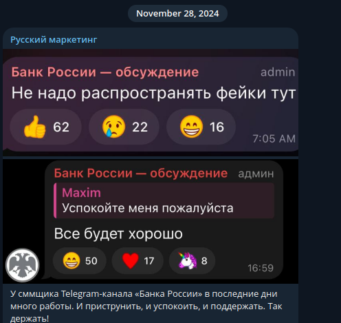 У Банка России уже есть опыт неформального общения. В ноябре 2024-го, когда рубль падал до 108 за доллар, SMM-щики успокаивали подписчиков фразами "Всё будет хорошо" и "Обняли". Но тогда был посыл. Теперь же - чистая абстракция, которую каждый понял по-своему.