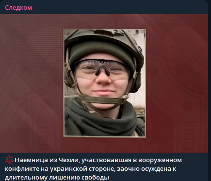В России заочно осуждена наёмница из Чехии, участвовавшая в вооруженном конфликте на украинской стороне, заочно осуждена к длительному лишению свободы