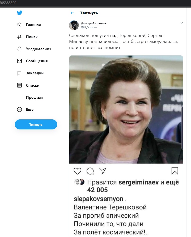 "Слепаков пошутил над Терешковой, Сергею Минаеву понравилось. Пост быстро самоудалился, но интернет всё помнит", - отметил он.