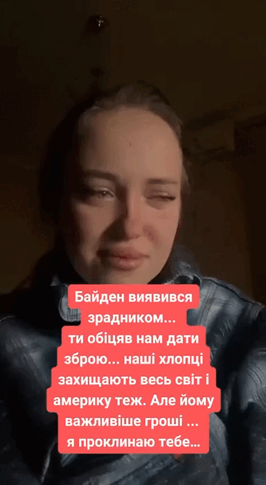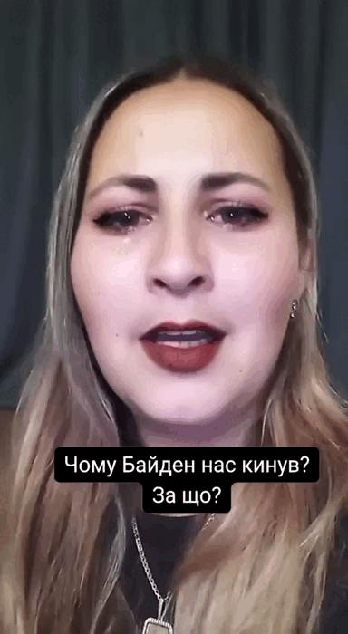 В другом видеоролике женщина плачет и поёт украинскую песню про любовь под фонограмму. Всё это сопровождает надпись: "Чому Байден нас кинув? За що?!"