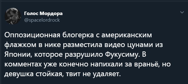 "Оппозиционная блогерка с американским флажком в нике разместила видео цунами из Японии, которое разрушило Фукусиму. В комментах уже, конечно, напихали за враньё, но девушка стойкая, твит не удаляет", - написал в своем микроблоге в Twitter Голос Мордора.